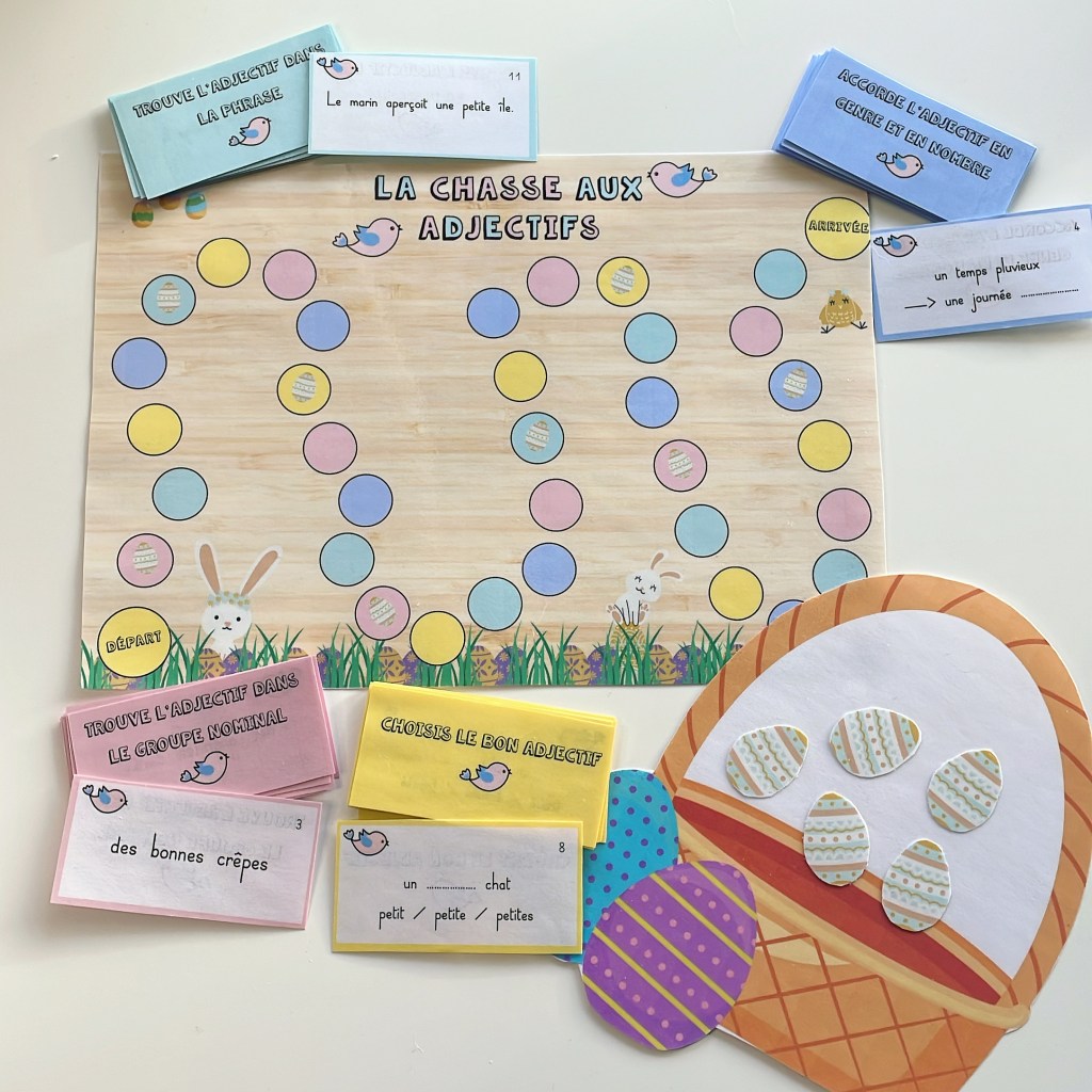 Afin de revoir cette notion pendant cette dernière semaine précédant Pâques, j’ai décidé de créer un tout nouveau jeu de plateau sur ce thème : La chasse aux adjectifs.