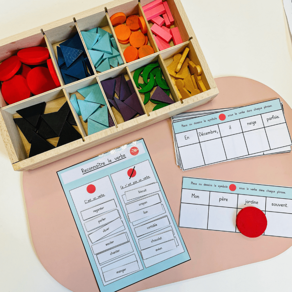 Pour ces ateliers, avec cette même envie de toujours faire manipuler au maximum les élèves, j’utilise un coffret de symboles grammaticaux Montessori afin de leur permettre de repérer la nature des mots utilisés dans une phrase.
