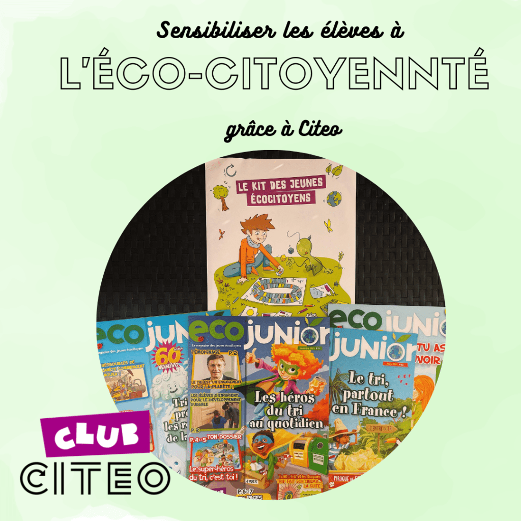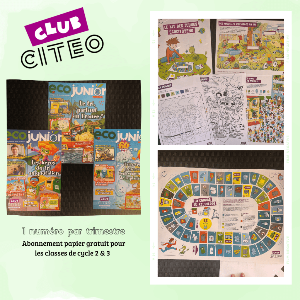 Club Citeo propose chaque année à 15000 classes de s’abonner et recevoir gratuitement le magazine Eco Junior, un trimestriel de 8 pages avec des dossiers thématiques, des interviews, jeux et BD, pour aborder les thématiques du tri, du recyclage, la préservation des ressources naturelles, la lutte contre les déchets abandonnés, la protection de la biodiversité, etc…