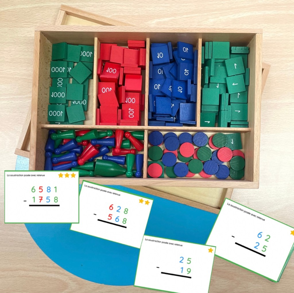 Il y a quelques temps, j’ai eu la chance de pouvoir observer le fonctionnement d’une classe Montessori 3-6 ans et j’ai pu découvrir que certains élèves étaient capables de faire des soustractions posées avec retenue(s) grâce aux timbres Montessori.